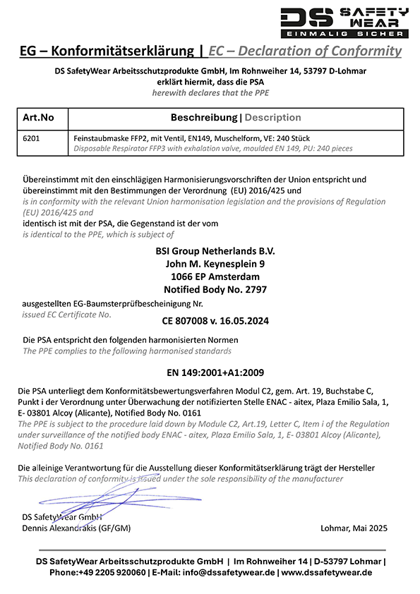DS SafetyWear Arbeitsschutzprodukte GmbH, Im Rohnweiher 14, 53797 Lohmar20 STÜCK FFP2 Maske Baumaske Atemschutz Feinstaubmaske mit Ventil ProSafe EN 149 1VE = 20 Stk
