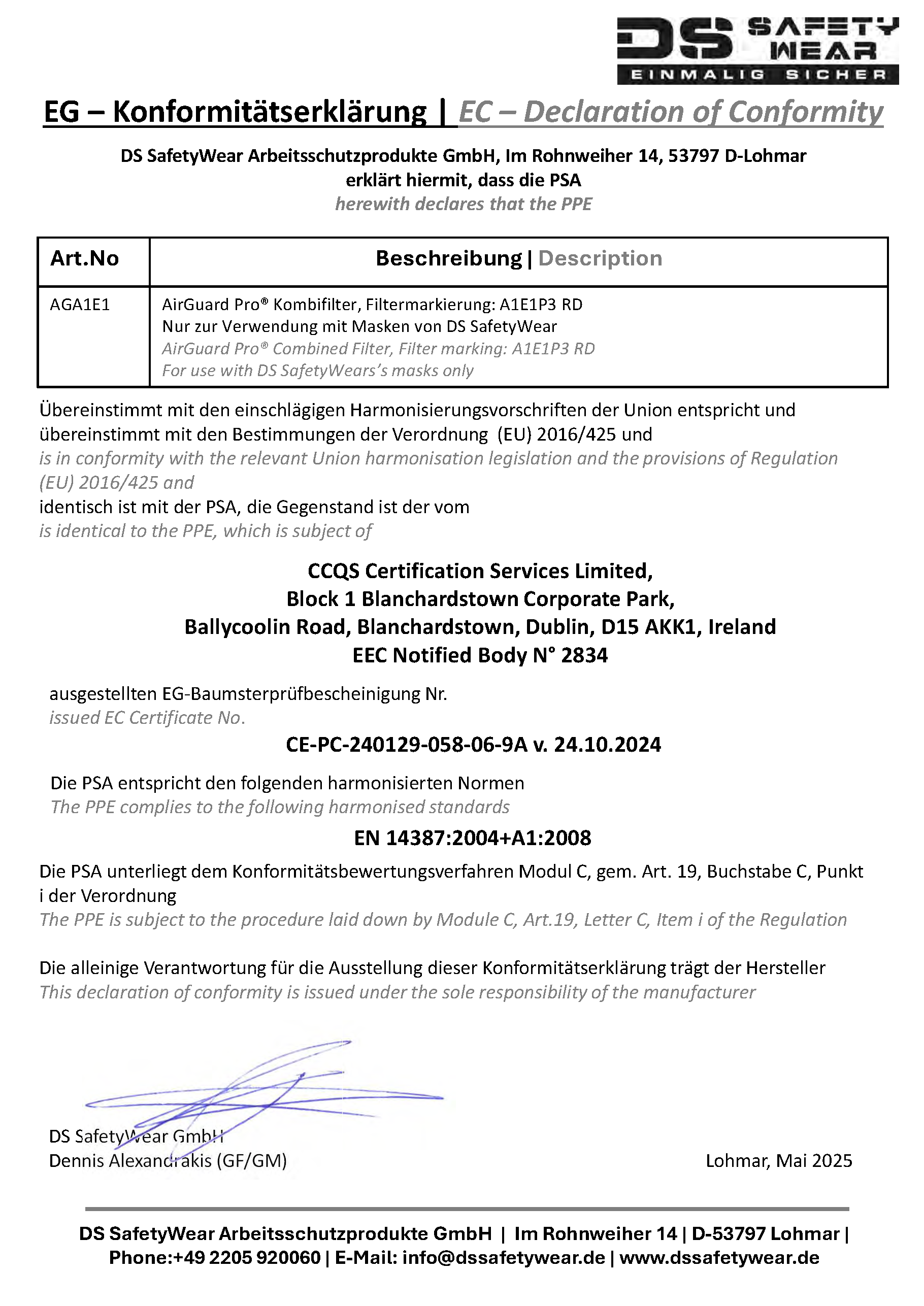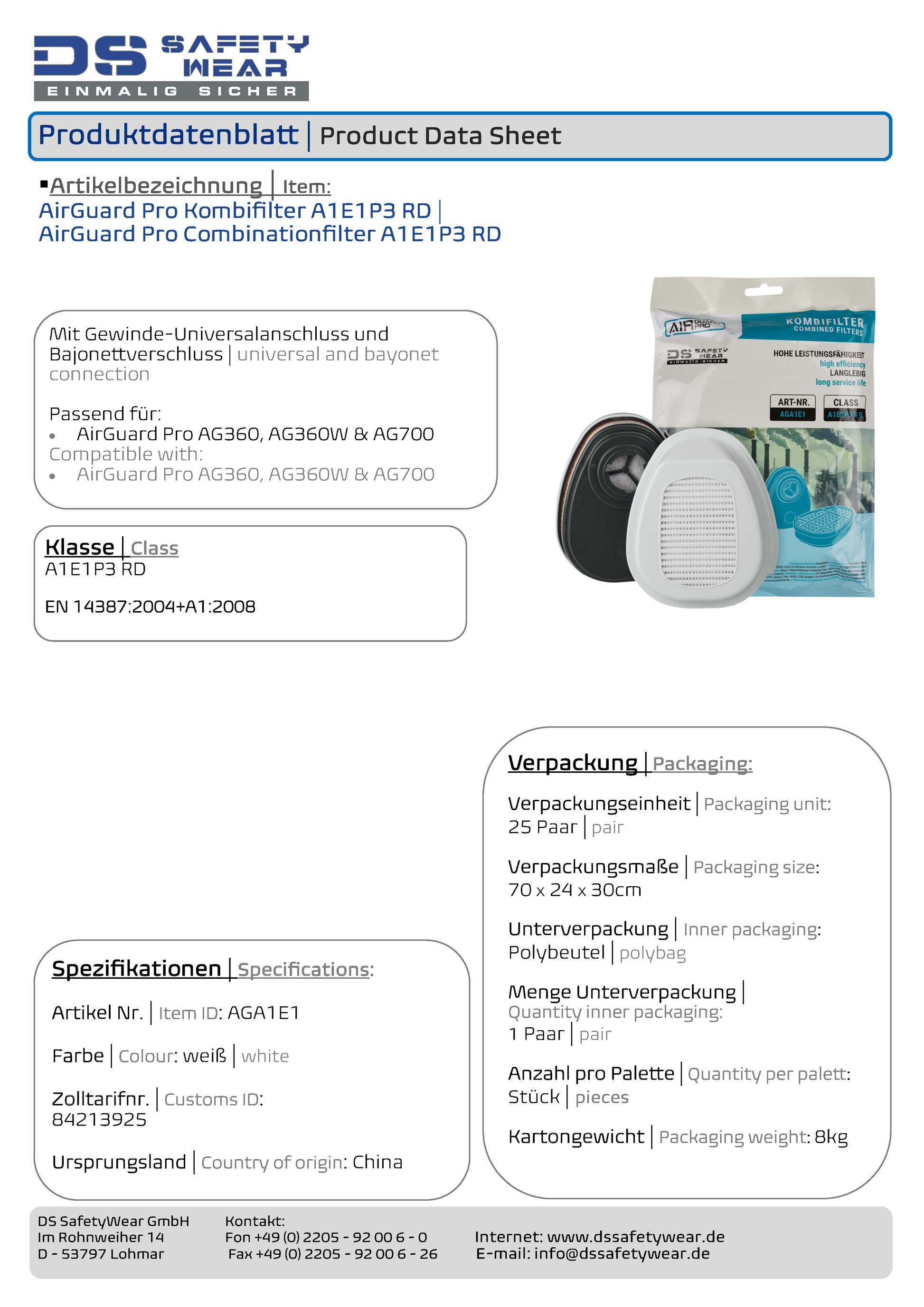 Der AGA1E1 Kombinationsfilter wurde speziell für den Einsatz mit den Halbmasken AirGuard Pro® 360, AirGuard Pro® 360 White und AirGuard Pro® 700 entwickelt. Er bietet umfassenden Schutz in anspruchsvollen Arbeitsumgebungen, in denen sowohl gefährliche Gase und Dämpfe als auch gesundheitsschädliche Partikel auftreten.