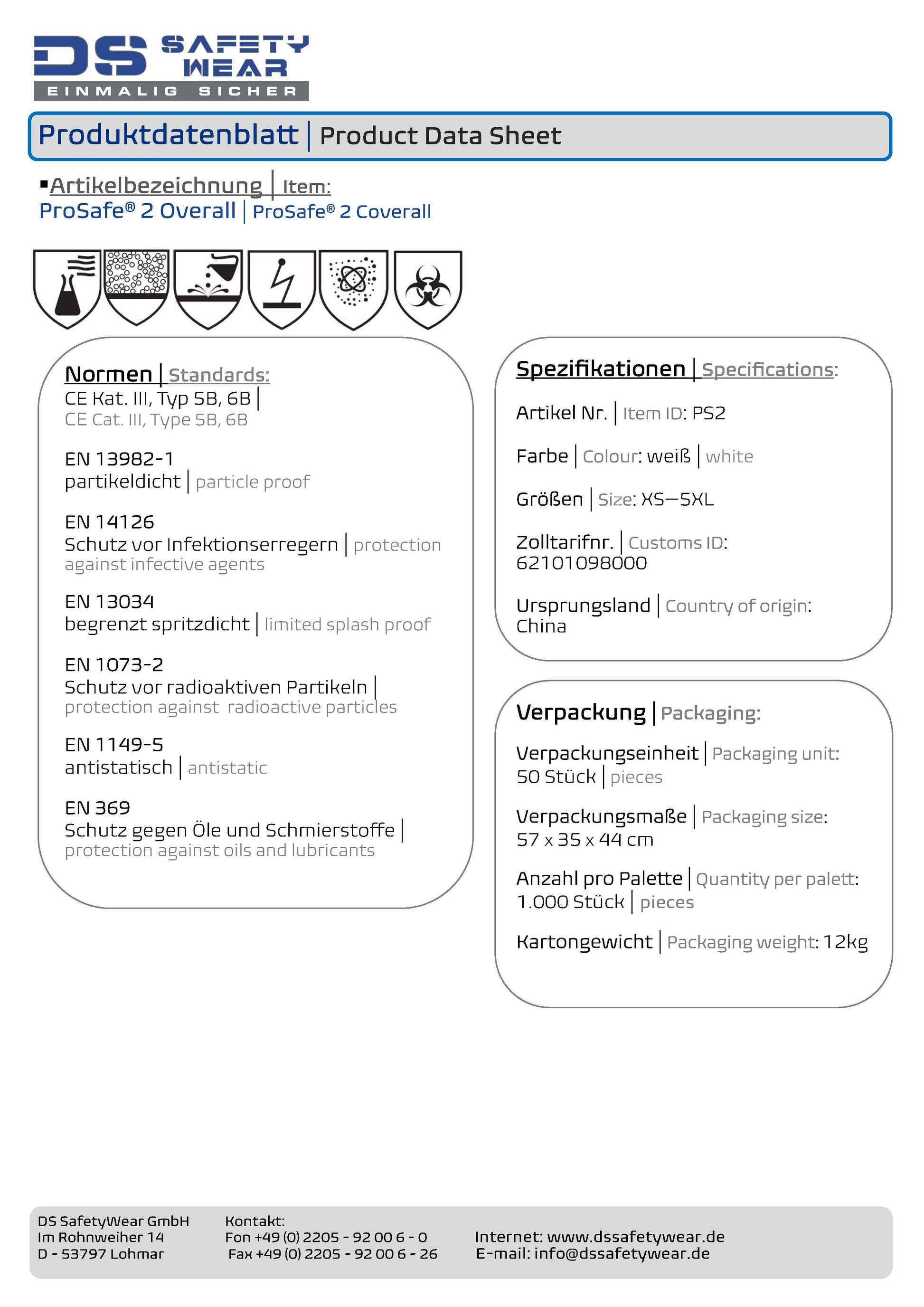 1VE = 1x ProSafe® 2 Einwegschutzanzug blau