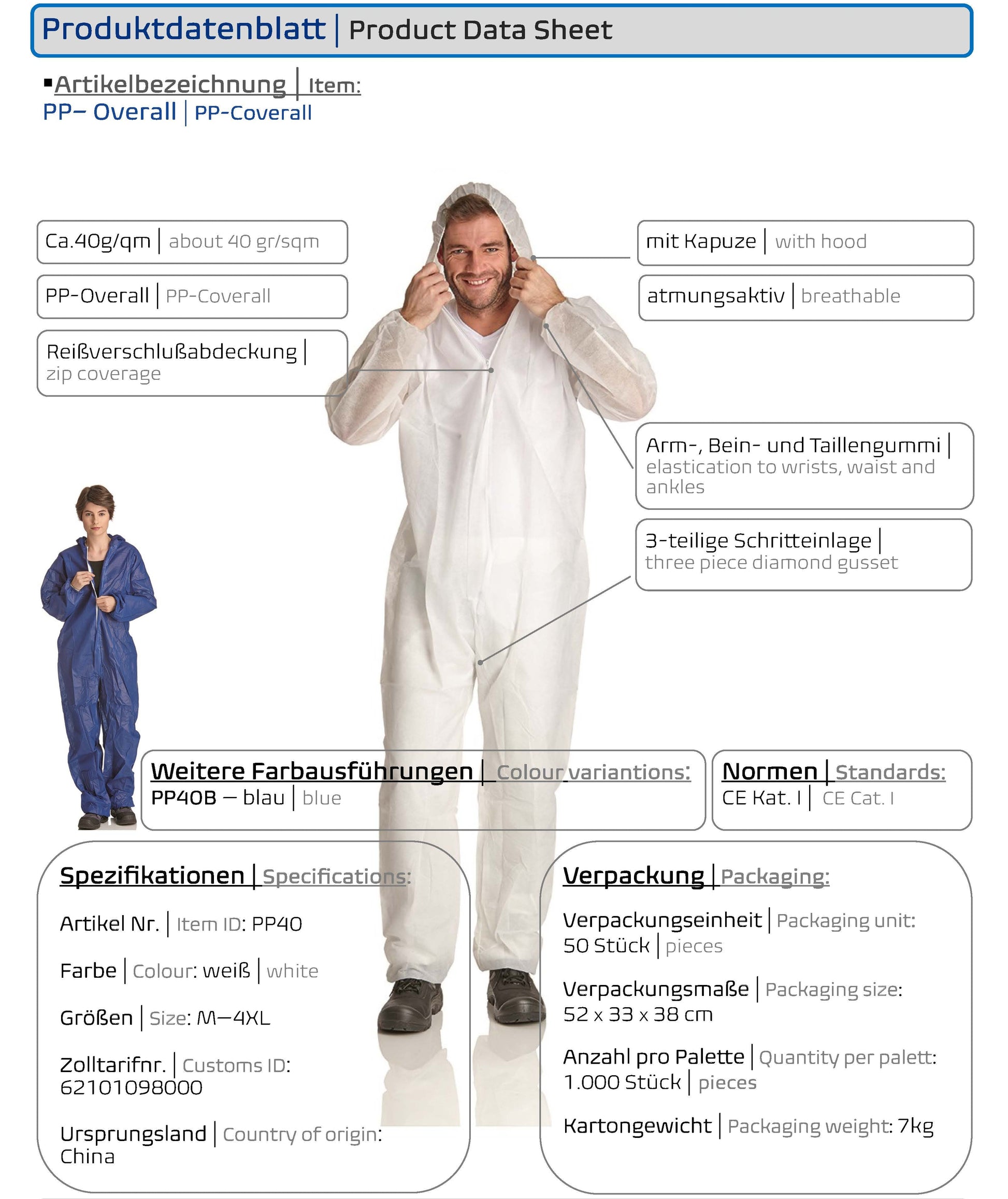 Der Schutzanzug besteht aus Polypropylen (PP) und ist leicht, luftdurchlässig und atmungsaktiv.