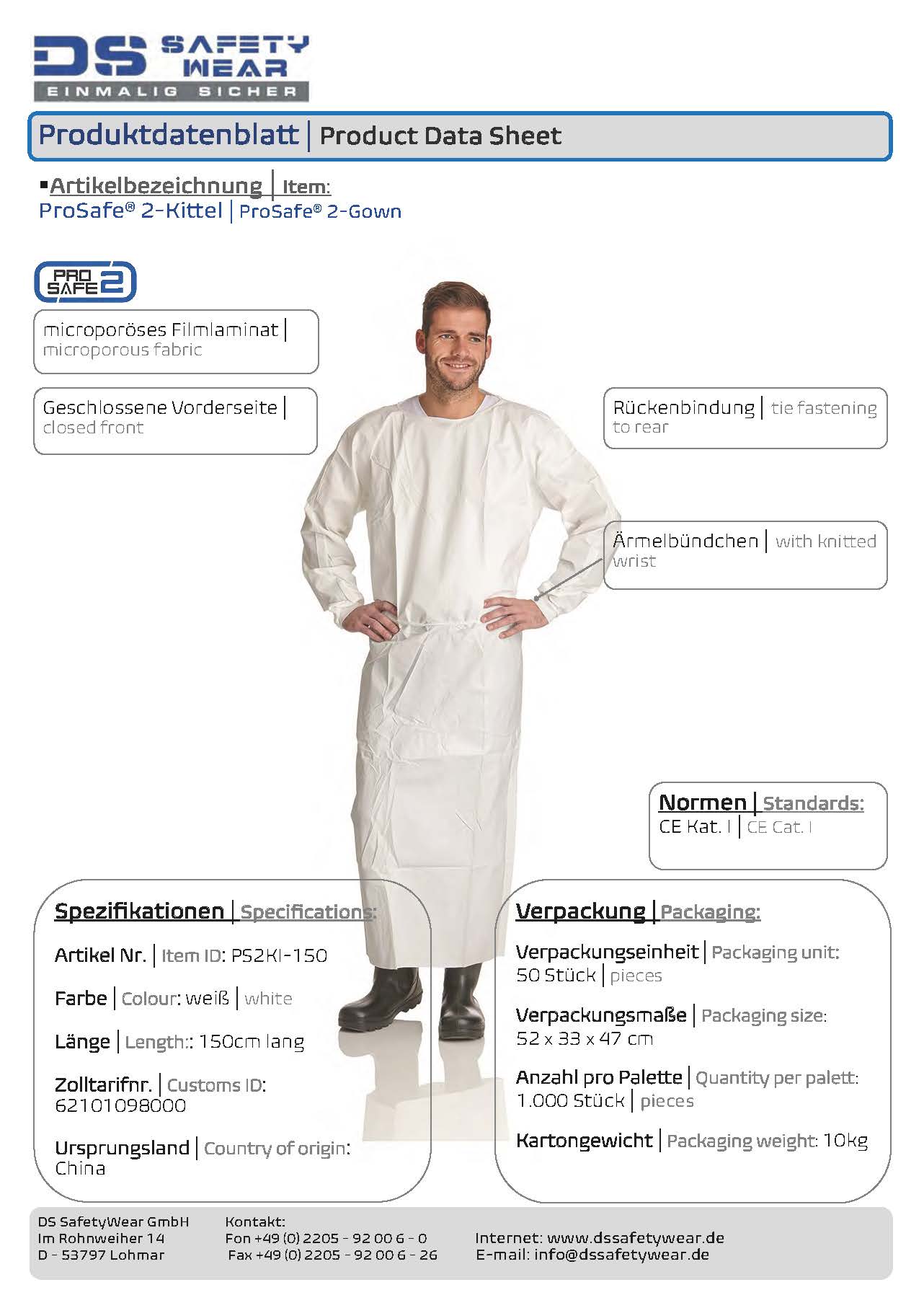 SONDERANGEBOT 50 Stück ProSafe®2-Kittel PS2KI-150 Einweg-Schutzkittel 150 cm lang Rückenbindung EN 14126 Farbe weiss