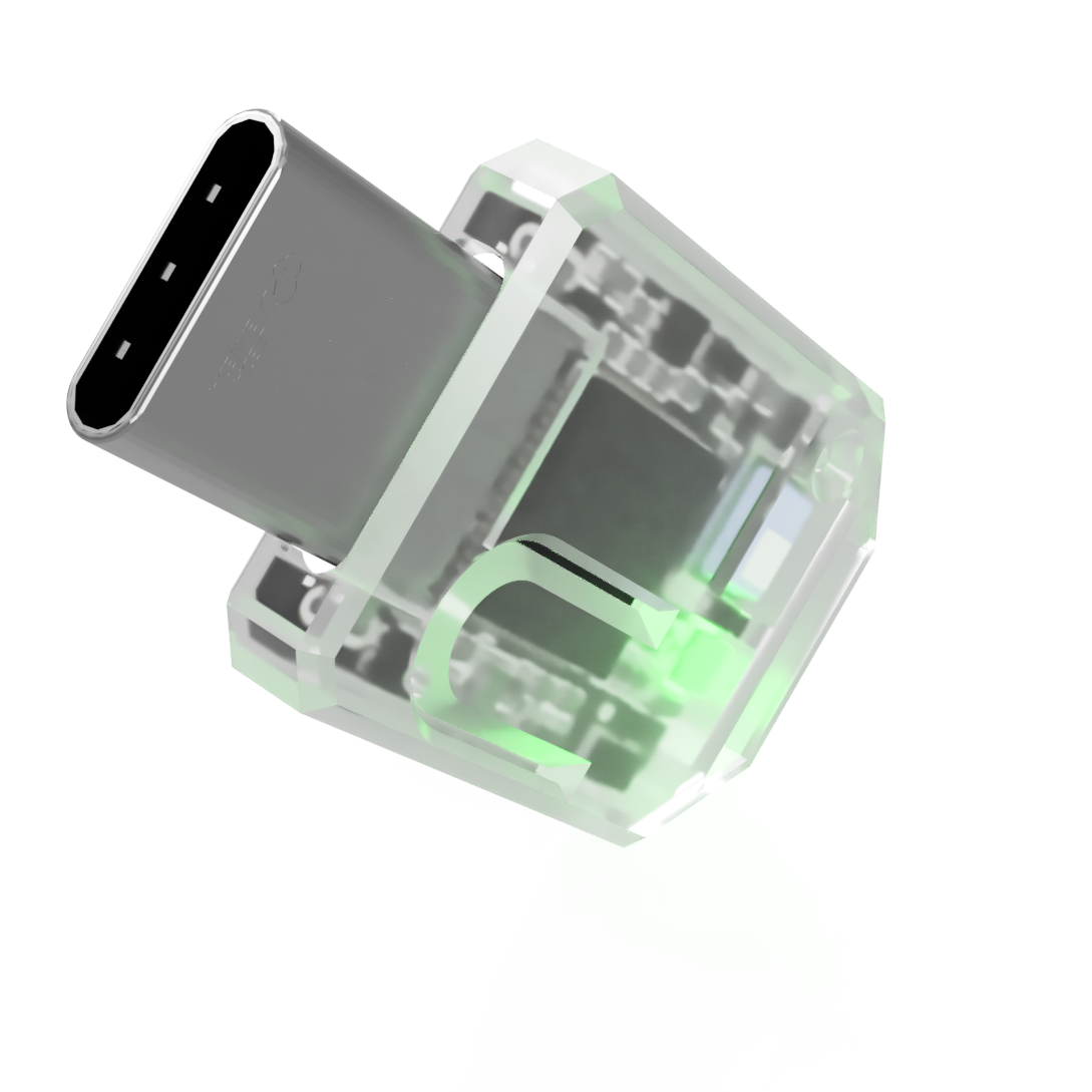 Das transparente, 3D-gedruckte Gehäuse ist leicht, stabil und modern. Durch die integrierte USB-C-Stromversorgung lässt sich der Sensor einfach über Smartphone, Laptop oder Netzteil betreiben – ganz ohne Batterien.