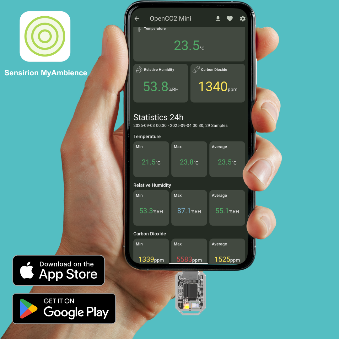 Bluetooth Low Energy (BLE): Verbinde den Sensor mit der Sensirion MyAmbience App (iOS & Android) für Echtzeitdaten, Diagramme und Verlauf.