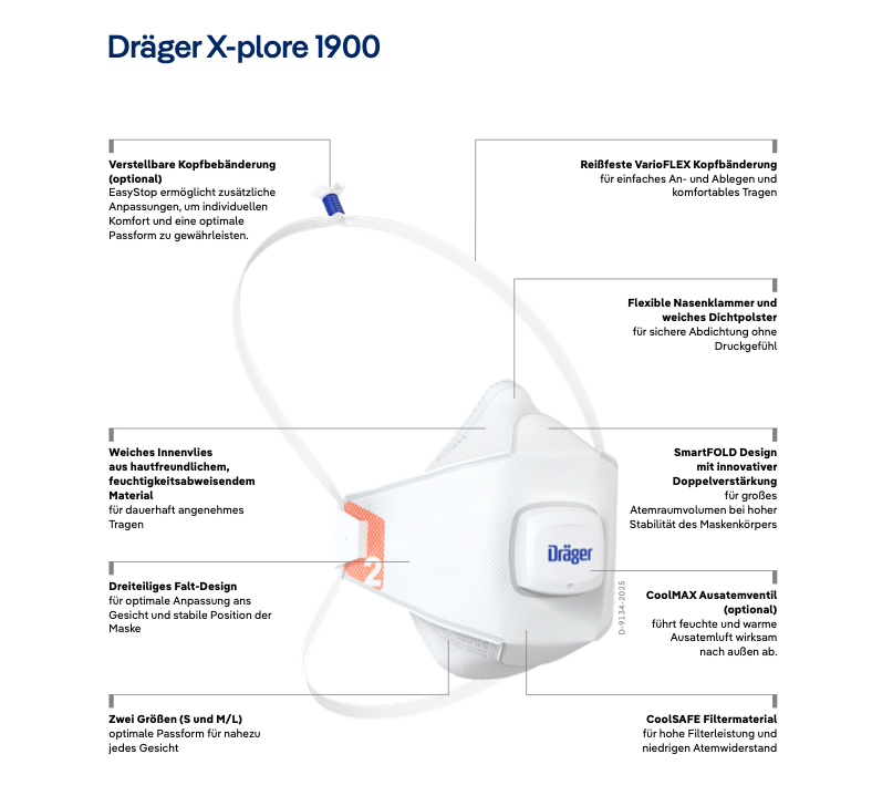 Die Dräger X-plore 1900 Premium FFP2 Staubmaske ist eine hochwertige, partikelfiltrierende Einweg-Halbmaske, die zuverlässigen Schutz vor Feinstäuben sowie festen und flüssigen Partikeln bietet. Dank ihres CoolSAFE-Filtermaterialsverbindet sie eine exzellente Filterleistung mit einem besonders niedrigen Atemwiderstand – ideal für langes, ermüdungsfreies Arbeiten selbst in staubintensiven Umgebungen.