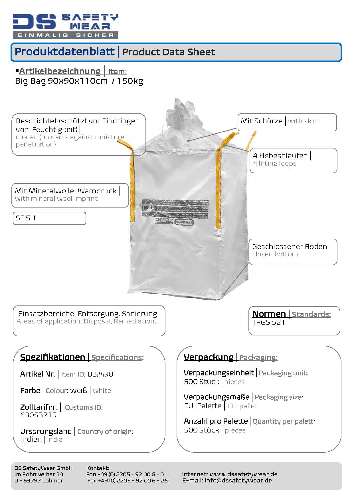 Der Big Bag erfüllt die Anforderungen gemäß TRGS 521 und ist für die Abgabe auf Entsorgungshöfen und Deponien zugelassen und geeignet.